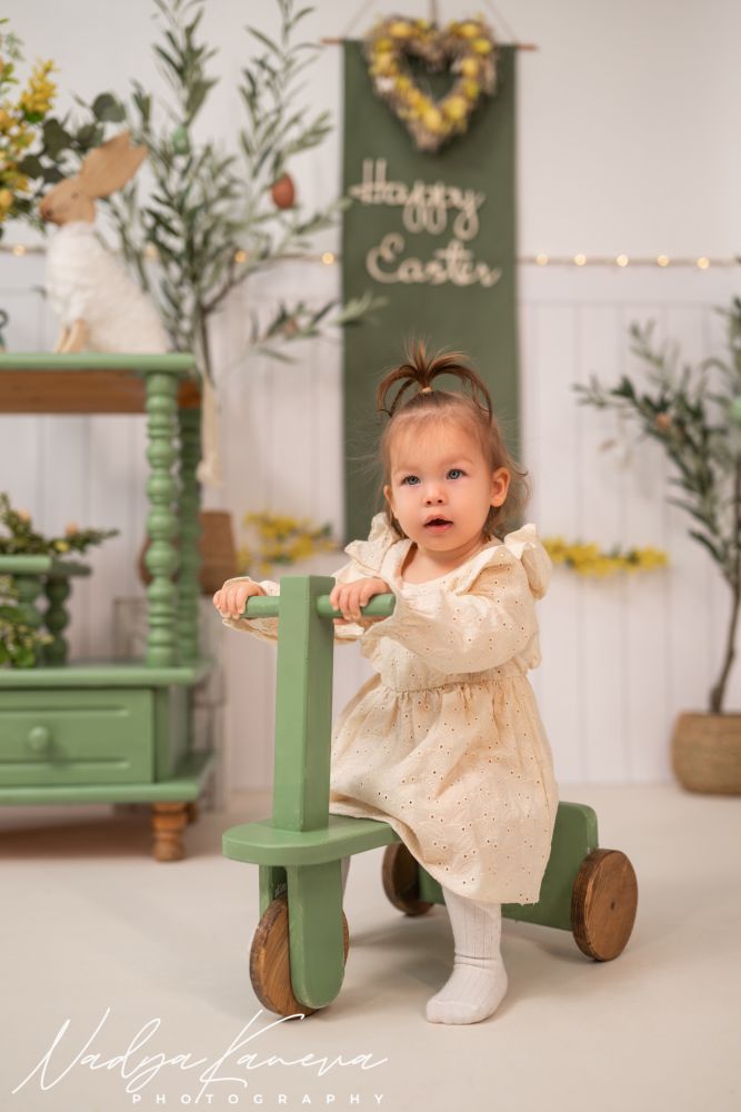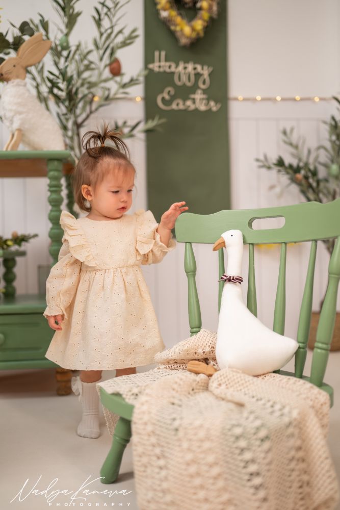 За фотосесиите е подготвена тематична пролетно-великденска декорация, която създава уютна и красива среда за снимки. Вниманието към детайла, меката светлина и спокойната атмосфера помагат децата да се чувстват комфортно, а снимките да изглеждат естествени и изпълнени с настроение.