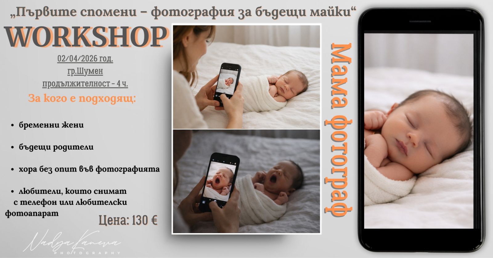 Този уъркшоп е създаден специално за бъдещи майки, които искат да се научат как да правят красиви, естествени и емоционални снимки на своето новородено.