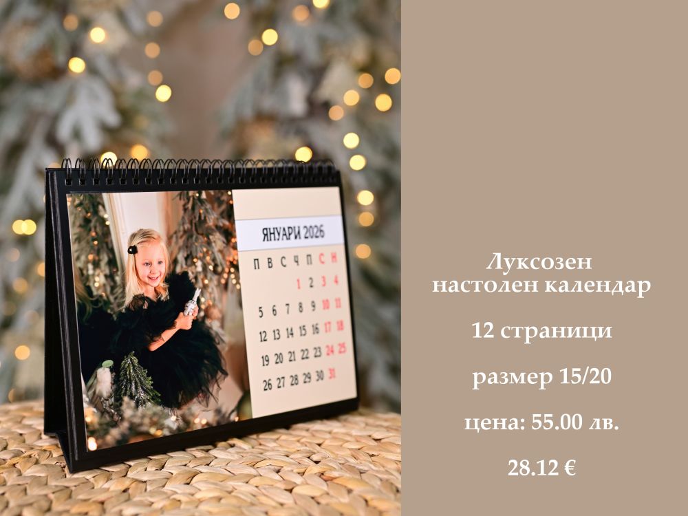 Луксозният настолен календар е изработен с внимание към детайла и предлага елегантен начин за организация през цялата година. Състои се от 12 висококачествени страници – по една за всеки месец, оформени със стилен дизайн и възможност за персонализация със снимка на клиента.